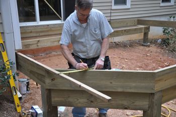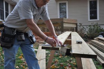 mätning av 2×10 tryckbehandlad joist längd för att förbereda för skärning., Använd en speed square för att kvadrera dina reglar.
