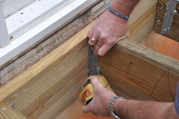 Notching a joist over a beam., Denna bjälklag var 1/4 ” högre än alla andra. Du kan klippa ut en del av reglaget eller lägga till shims till en smal bjälke för att jämna ut toppen av däckramen.