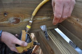med hjälp av en palm-nailer eller hammare för att installera en bjälklag galgar med 1-1 / 2″ teco naglar till liggaren styrelsen.